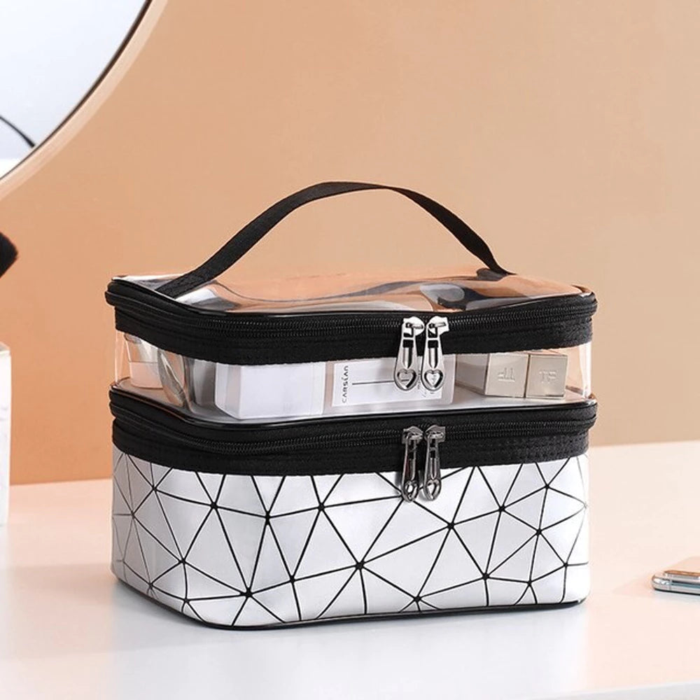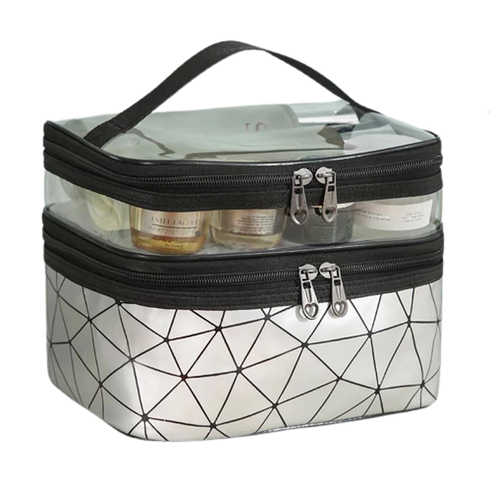 See mahukas naiste kosmeetikatarvete kott on moodne ja mugav aksessuaar reisimiseks.